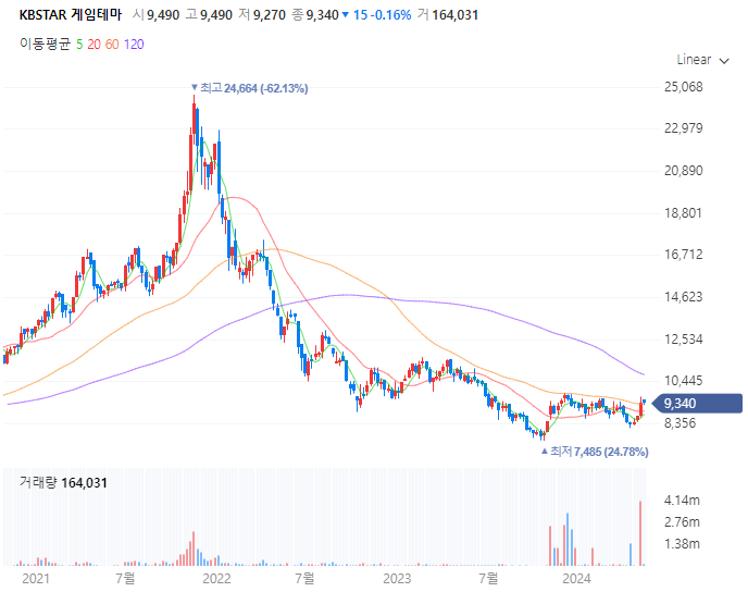 아래 게임테마 ETF 주봉을 보시면 아직은 산업 전반에 대한 반등인지는 좀 더 두고 봐야겠네요.