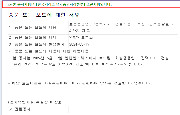 해당 시간에 효성중공업의 사업분할 계획 뉴스가 나옵니다.