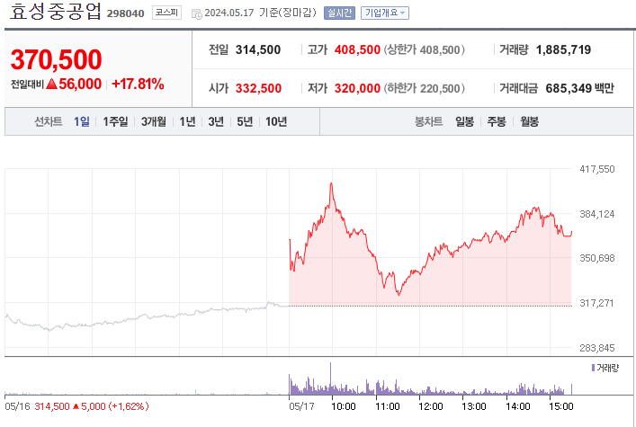 '24/5/17(금) 종목 하나가 하루에 20% 가 넘는 변동성을 보이며 롤러코스터를 탔습니다. 개 잡주냐고요? 아니요 요즘 실적과 미래 먹거리가 확보로 관심을 받고 있는 변압기 관련 우량주입니다. 사실 계속 우상향 해서 주가가 많이 올랐고, 생산하는 제품의 무게만큼이나(변압기 무겁죠) 산업의 변동성(주가 아니고 산업입니다.)이 적은 만큼 조금 이례적이라 생각했습니다. 그럼 어떤 일이 있었는지 살펴보겠습니다.