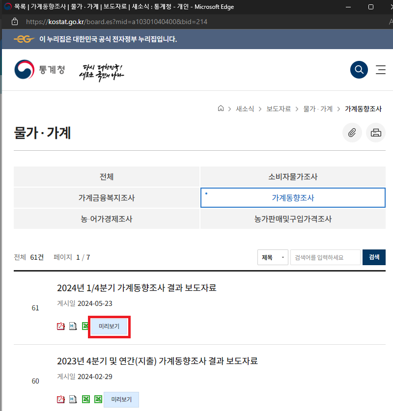 그래서 통계청에서는 해당 자료를 발표하고, 보도자료를 배포합니다.