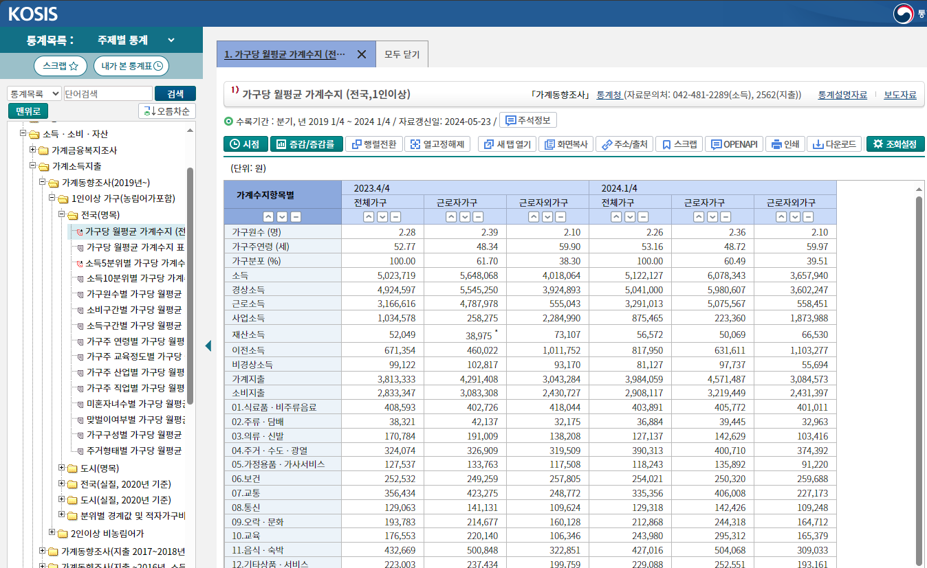 가구당 월평균 가계수지 (전국,1인이상) (kosis.kr)