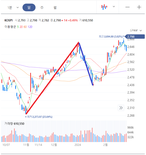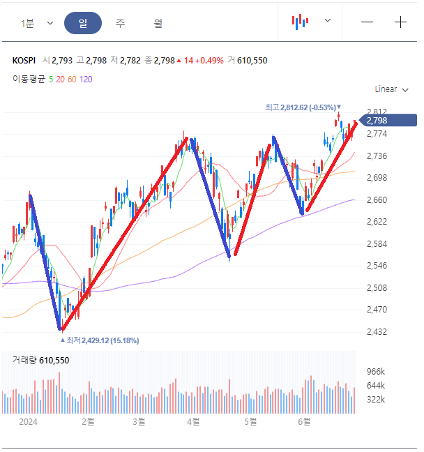 '24년 올 상반기 한국 주식시장은 변동성은 큰 것 같은데 돌아보면 제자리인 느낌입니다.그래서 코스피 차트를 한번 살펴 보겠습니다. 삼각형 모양이네... 코스피 주봉 그래프에서 하단선,