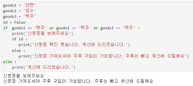 print('신분증 가져오셔야 주류 구입이 가능합니다. 주류는 빼고 계산해 드릴게요)