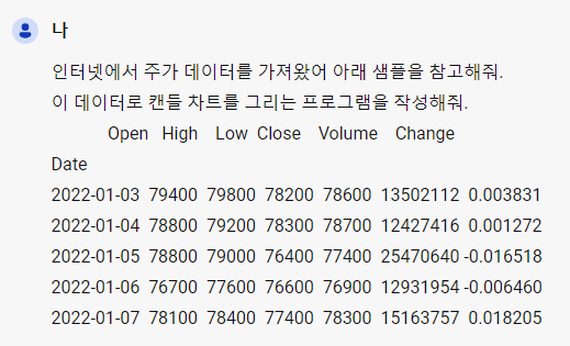 데이터 구성이 시초가, 고가, 저가, 종가 순으로 구성되어 있어 캔들 차트를 그릴 수 있겠네요.