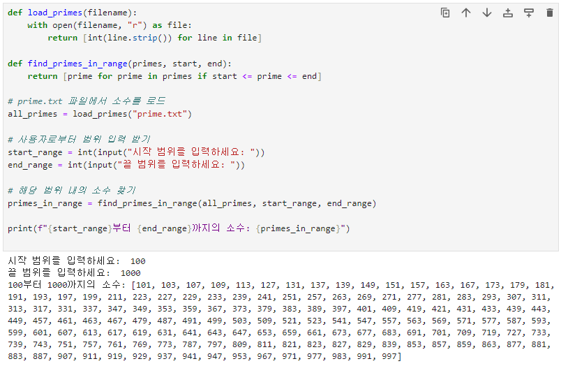 입력받은 범위의 소수들을 파일 prime.txt 에서 찾아서 출력하는 파이썬 코드를 작성해 줘.