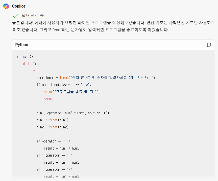 사용자가 입력한 사칙연산을 수행하는 프로그램 작성을 시켜 보겠습니다.